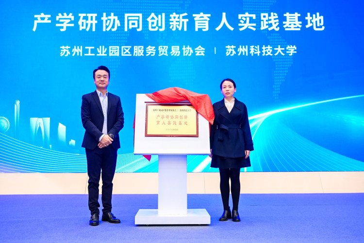 的人才培养中来,为创新性人才培养提供优质的实践基地。活动中,张媛、冯丽艳等与协会会长张鹏一起为“苏州工业园区服务贸易协会&苏州科技大学产学研协同创新育人实践基地”揭牌。
